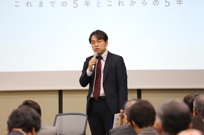 すべてのSessionが終わった後、共催団体の1つ、公益財団法人地域創造基金さなぶりの鈴木佑司専務理事があいさつしました。「今日のシンポジウムで共通しているのは、みなさんの笑顔が非常に印象的だったことです。企業と地域との新しい関係が生まれているのだ、と。非常に刺激的で、印象的な数字などもありました。この後に続くきっかけもあったと思います」 8 それを受けてETIC.の山内は「東北は実験場になりうるかを考えてきたのですが、非常に学びの多い場だということを改めて確認できました」と話しました。 9 「それぞれのSessionでテーマは異なるものの、『東北の地方創生』に対する企業としての関わり方が提示され、5年という節目を迎えたいま、今後の方針を立てる上で参考になるエッセンスが多様に盛り込まれていました」とある参加者はアンケートに書きました。