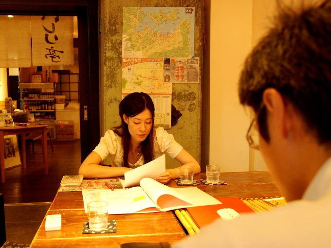 パンフレット作りの打ち合わせをする学生と受入企業の専務。インターン期間中は真剣な議論が日々交わされました