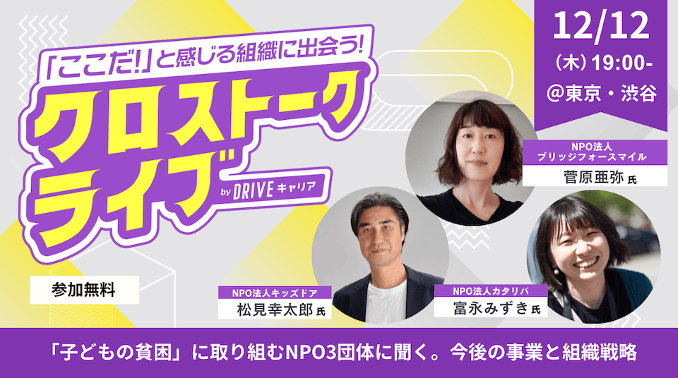 DRIVEキャリアクロストークライブ 「子どもの貧困」に取り組むNPO3団体に聞く。課題解決に向けて次の打ち手をどう描く?