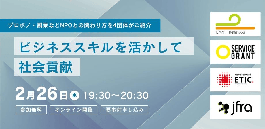 ビジネススキルを活かして社会貢献~プロボノ・副業などNPOとの関わり方を4団体がご紹介~